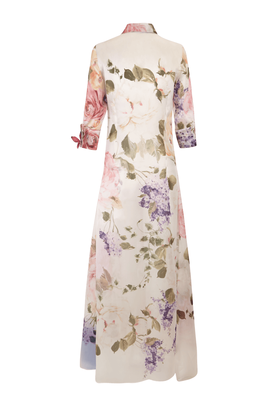 Shirt dress made of silk organza with floral print. Three-quarter sleeves and floor length. Fitted style. Optional handmade butterfly detail.