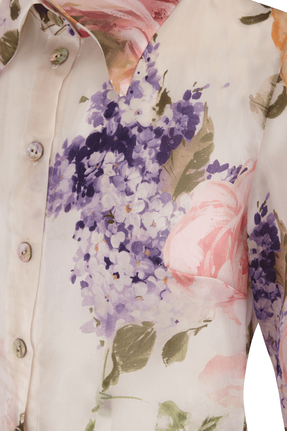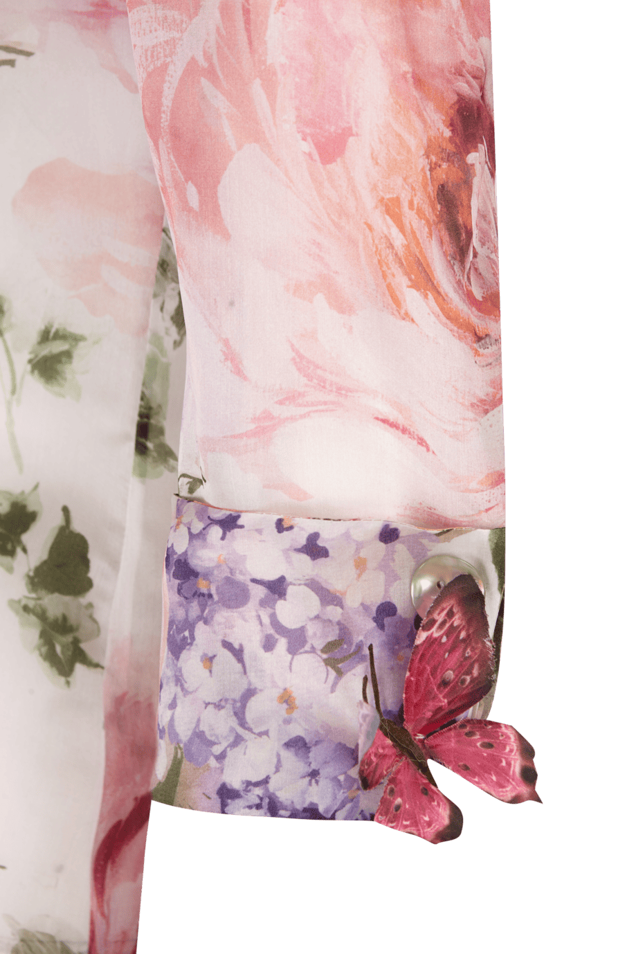 ORGANZA SILK SHIRT DRESS, WITH FLORAL PRINT AND HANDMADE BUTTERFLY DETAIL