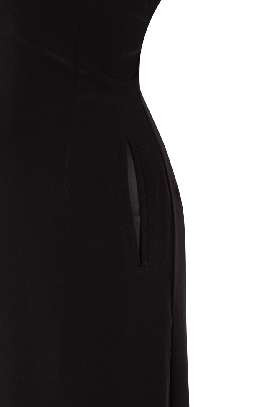 Falda de crepe negro, estilo cintura alta, larga hasta el suelo, con bolsillos laterales.