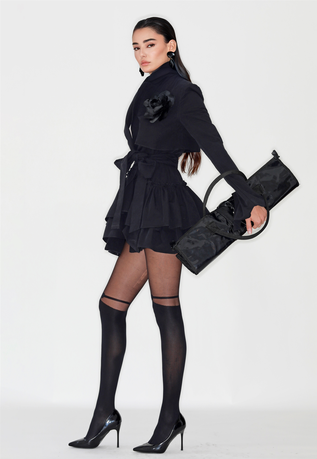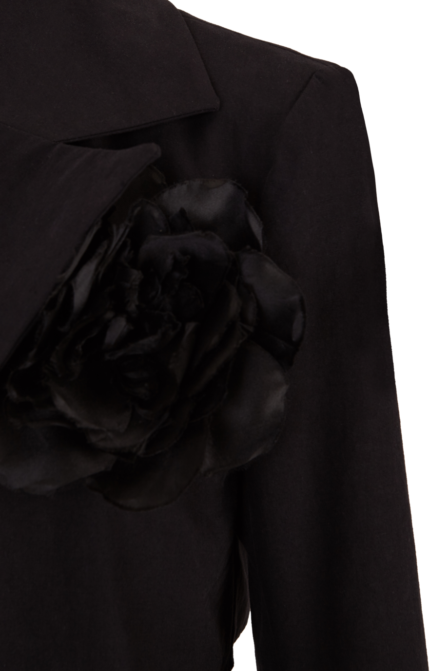 Gabardina de primavera, de lino y algodón, estilo fitted, con volantes y adorno de flor artesanal a mano.