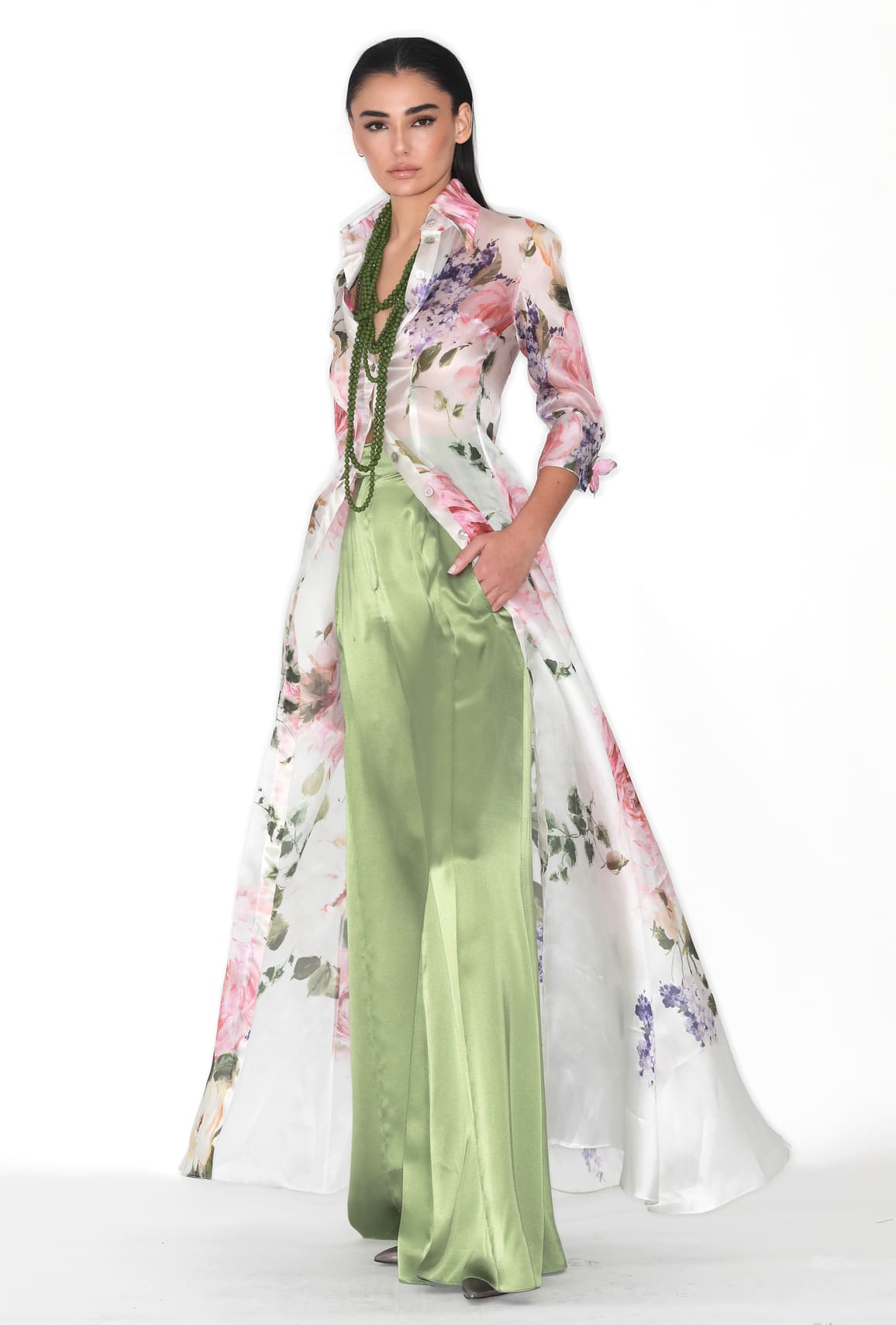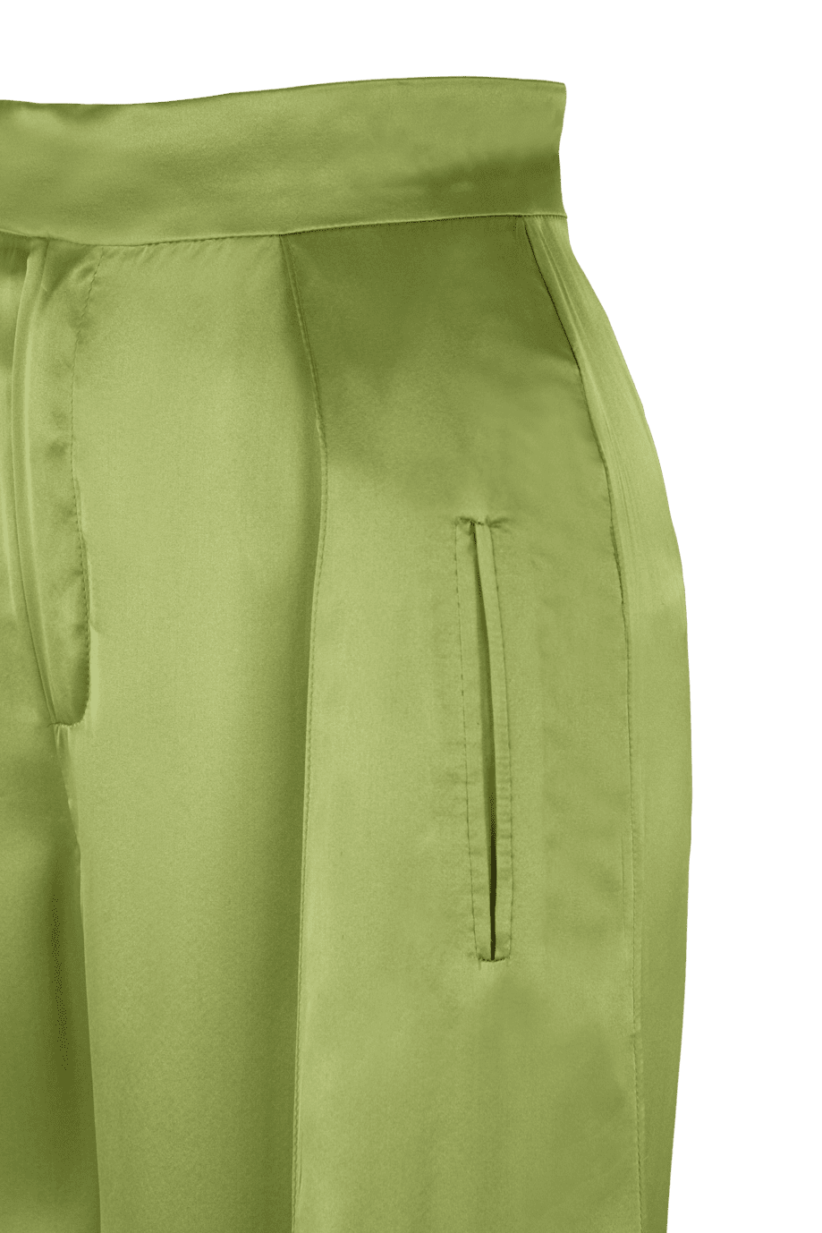 Pantalón estilo palazzo, de seda color verde. Largo hasta el suelo.