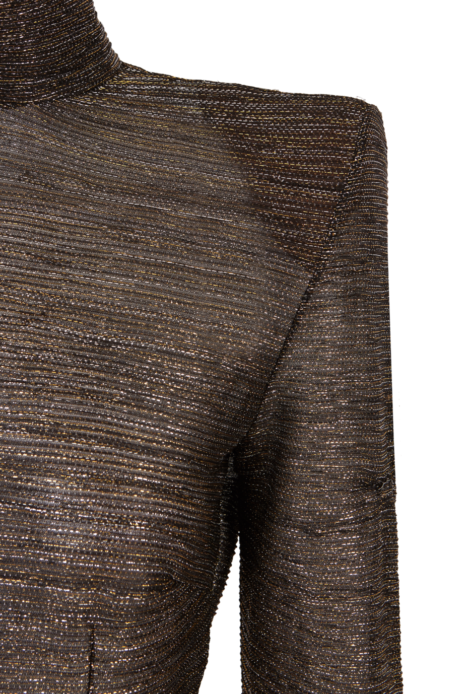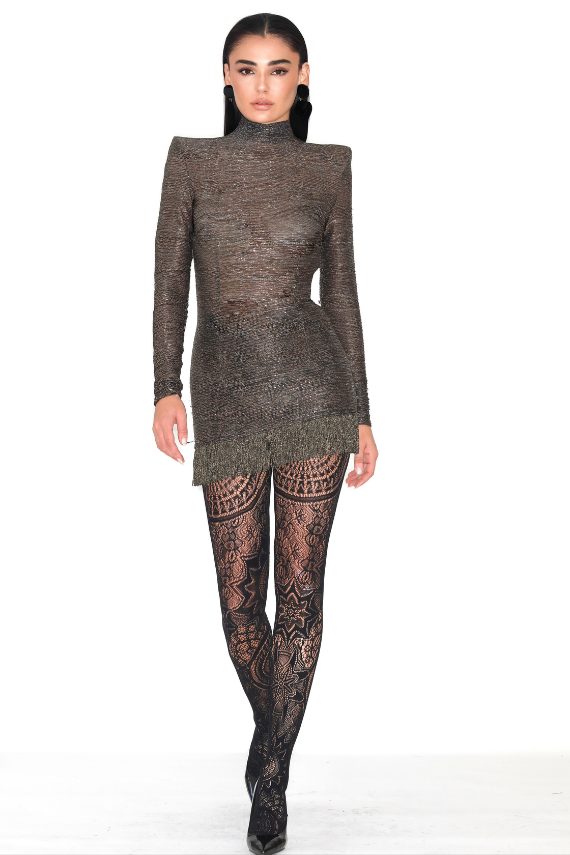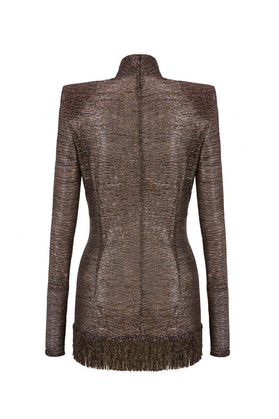 Vestido mini de lamé dorado, manga larga, hombreras pagoda y remate de flecos.