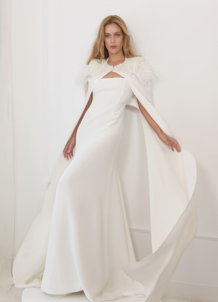 El juego de capas es otro de los grandes recursos de la novia de invierno. Vestidos base de seda o crepé pueden combinarse con capas, abrigos o sobrevestidos que se retiran en el interior, ofreciendo distintas lecturas del mismo look.